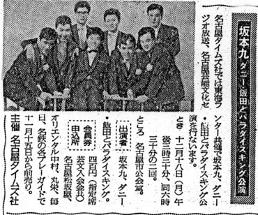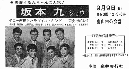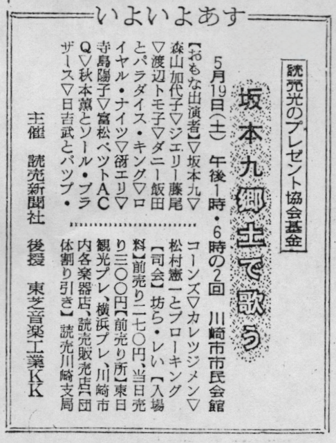 出演:坂本九 ダニー飯田とパラダイスキング(コーラス:増田多夢 佐野修 九重佑三子 ダニー飯田 電気ギター:上野保夫 ドラム:ジョージ大塚 電気ベース:石田智)司会:坊られい