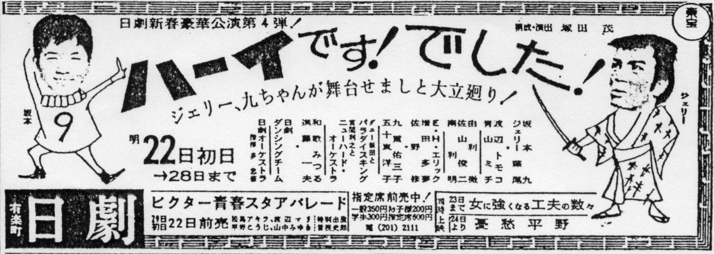 11:15 14:40 18:05 Capacity:2,540席 Ticket:早朝・学割:200円 一般席:250円 指定席:500円 演出:山本紫郎 同時上映:銀座の恋人たち