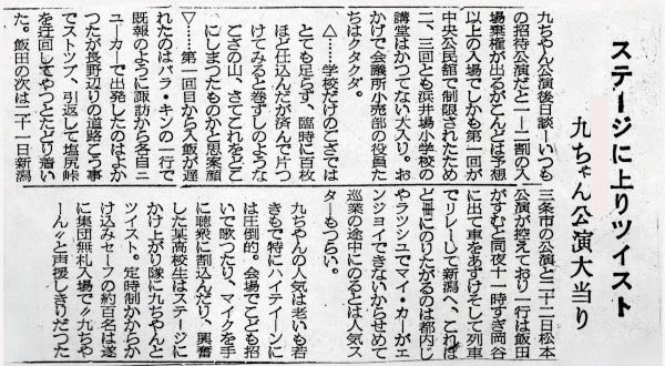 40日間の舞台を務める九ちゃんだが、途中、盲腸炎のため休演