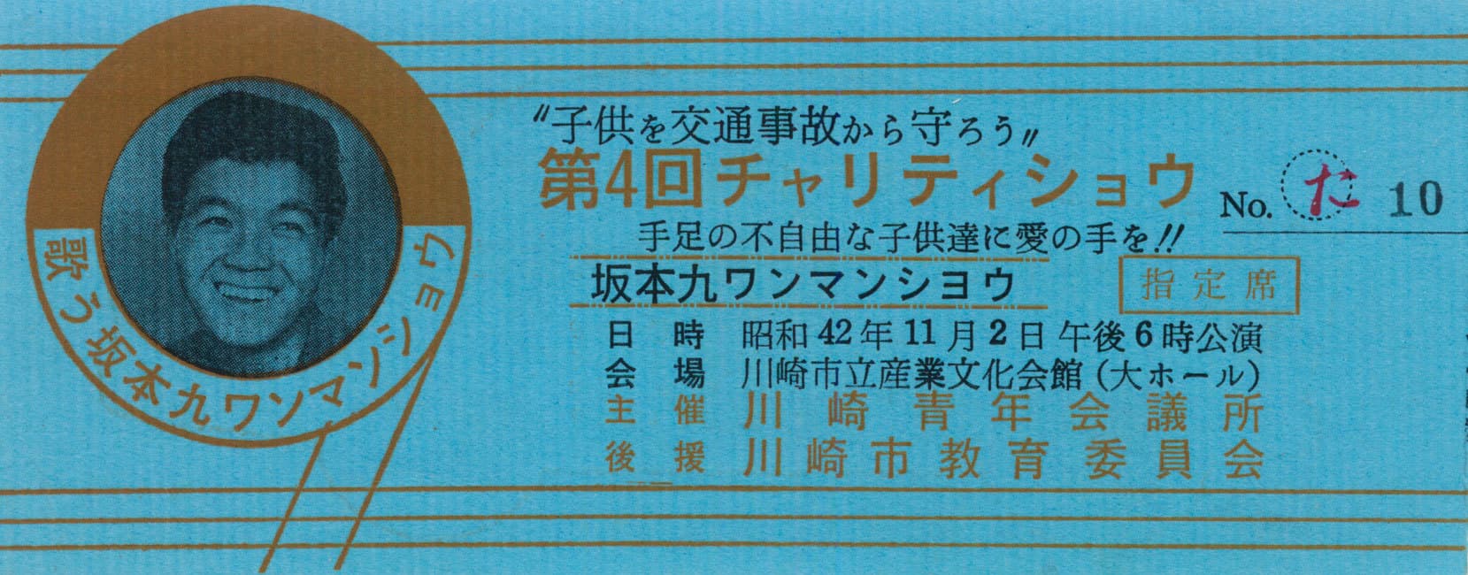 6月11〜17日8日間公演のうち坂本九11日〜13日までの交互出演 構成・演出:北川信造 振付:荒川和子 高木翌 音楽:筒井広志 制作:池田豊和 《同時上映》日本一のゴマすり男 (週後半)姿三四郎