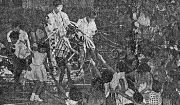人気歌手「九ちゃん」を見ようと開演20分前には押し掛けた2,000人の観衆のために、先月6日に開館したばかりの正面ドアがこわされ、観衆に押しつぶされた女子高生ひとりが失神するという事故がおこった。