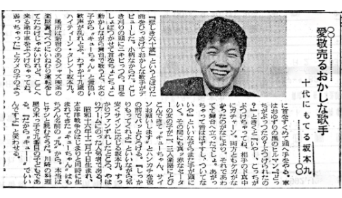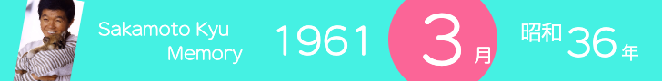 1961-01-16(月) | 東芝レコードシングルレコード「砂漠の恋の物語」「GIブルース」RELEASE 文化放送 07:40〜07:45「九ちゃん!ハイお嬢さん」放送開始 ON AIR 東京テレビ 21:15〜21:45「ピアスナインショー」ON AIR 新東宝映画「地平線がぎらっぎらっ」坂本九主演で3月1週公開と発表 |