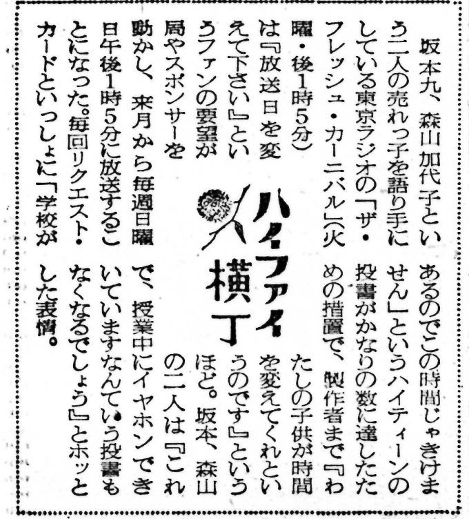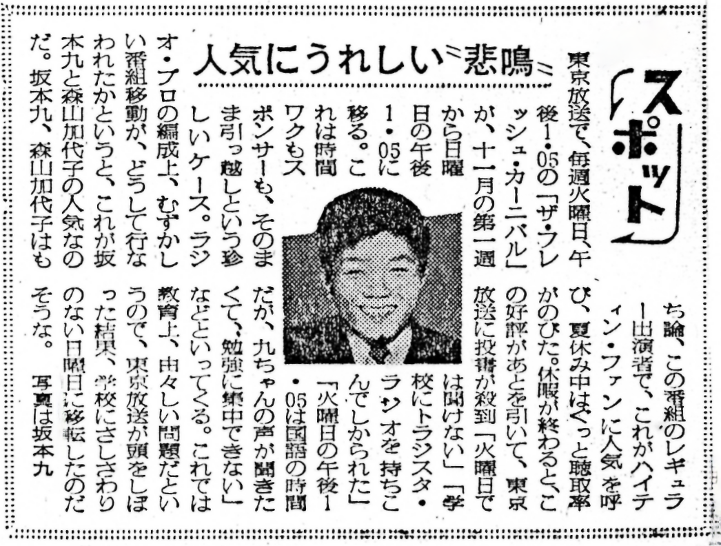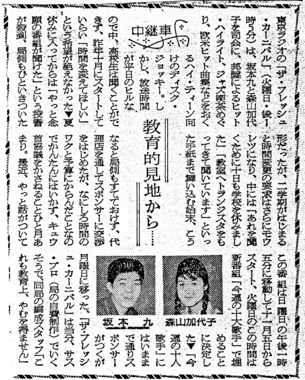 ラジオ東京系 毎週火曜 13:05〜14:00 坂本九 森山加代子のフレッシュコンビで送る1時間の軽音楽ディスクジョッキー