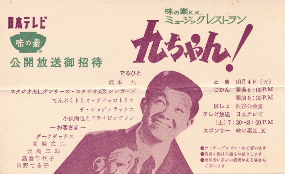 1966-12-24(土) | 松竹・お正月映画「九ちゃんのでっかい夢」試写会~築地・松竹本社試写室 日本テレビ 19:30~20:00「ミュージックレストラン 九ちゃん!」ON AIR |