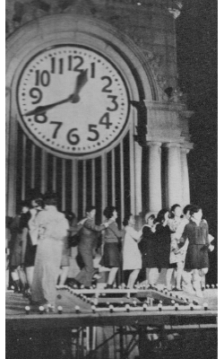 九ちゃんと後援会メンバーで、時計台の上で「ジェンカ」を踊る。