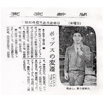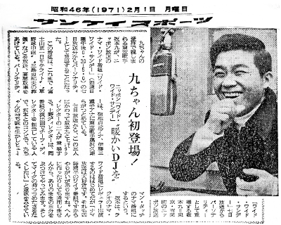 九ちゃんの愛称で親しまれる東芝歌手坂本九が、二ッポン放送のナマ・ワイド番組「ワイド・ワイド・サンデー」(毎週日曜午後0:30-5:00)の7日放送分からパーソナリティとして登場することになった。この番組は、これまで「富士山頂一日サテライト」「草野球中継」「三島由紀夫の葬勝」などを放送、高聴取率をあげている。パーソナリシィーは、菊池貞武アナ、伊藤三重子アナに東芝歌手黒沢久雄らがつとめている。